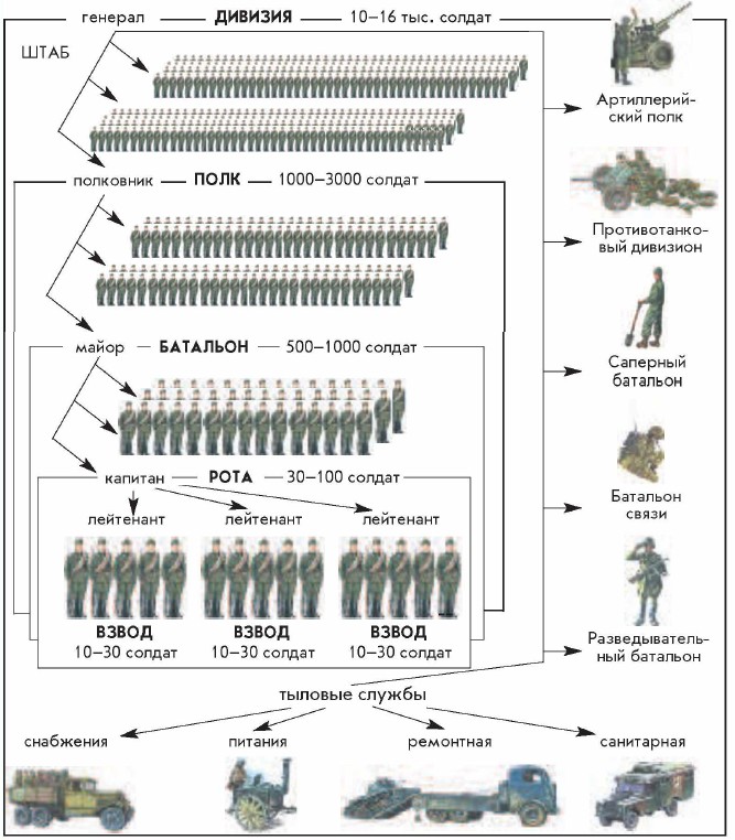 У англичан было в два раза меньше самолетов, а истребители, способные на равных сражаться с новейшими немецкими машинами, выпускал всего один завод. Однако немецкая разведка не определила первоочередные цели и даже не знала, что странные сооружения на побережье — это радары, которые заранее могут обнаружить самолеты противника. В результате немцы теряли примерно в два раза больше самолетов, чем англичане, но постепенно выводили из строя их аэродромы и радары. После того как английские бомбардировщики совершили налет на Берлин, Гитлер приказал наносить «удары возмездия». Немцы перешли к ночным бомбардировкам жилых кварталов. Английская авиапромышленность получила передышку, и к осени 1940 года английские истребители нанесли решающий удар по немецким силам. Почему удались блицкриги на Балканах?В октябре 1940 года итальянские войска напали на Грецию. Однако греческая армия нанесла им поражение и перешла в контрнаступление. Тем временем в соседней Югославии в марте 1941 года генерал Симович, симпатизирующий англичанам, сместил пронемецкое правительство. Гитлер решил вмешаться в войну на Балканах. С 6 апреля 1941 года немецкая армия с территории Австрии, Венгрии и Болгарии обрушилась на Югославию. Бомбардировщики за три дня превратили югославскую столицу Белград в руины, под которыми погибло более 17 тыс. человек. Югославская армия, имевшая всего 300 боеспособных самолетов и ни одного танка, отступала. Словенцы и хорваты по призыву своих националистов «бороться за создание собственных государств» дезертировали из армии, где преобладали сербы. К 17 апреля король покинул страну, а остатки армии капитулировали. За неделю до этого немецкие войска перешли в наступление против Греции. Прорвав фронт, танковые силы Германии окружили почти всю греческую армию у албанской границы. В конце апреля 1941 года греческий король Георг II и союзные английские войска спешно эвакуировались на остров Крит. 20 мая 1941 года над островом появились немецкие самолеты, с которых на английские позиции посыпались бомбы, а на парашютах высадилось сразу 3 тыс. десантников (в последующие дни — еще более 20 тыс.). После недели боев английский генерал заявил, что «войска... достигли предела выносливости». Английский флот, потеряв из-за бомбежек 8 крупных кораблей, вывез с Крита часть войск, и все-таки 12 тыс. солдат попало в плен к немцам. Почему пехотная дивизия была основным тактическим соединением Второй мировой войны?Организация и численность подразделений дивизии примерная. В разных странах они различались.