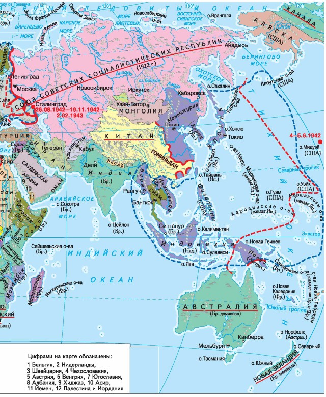 Глава 3. Пожар Второй мировой войны (1939—1945 гг.) § 8—9. Победа над фашизмом (продолжение)Еще раньше, в июне 1942 года, на Тихом океане в битве у атолла Ми́дуэй сошлись авианосные соединения флотов Японии и США. Японцы, имевшие целью захватить Алеутские острова, намеревались предварительно уничтожить американские самолеты, базирующиеся у атолла Мидуэй. Американцам удалось расшифровать радиосообщения японцев и скрытно подвести к атоллу свою эскадру. В бою американцы потопили все 4 японских авианосца, уничтожили 261 самолет, потеряв при этом 1 американский авианосец и 147 самолетов. Военно-морской флот Японии утратил свое превосходство в центральной части Тихого океана.
