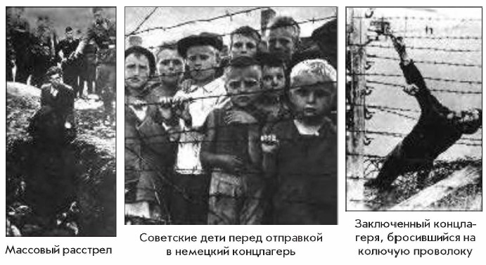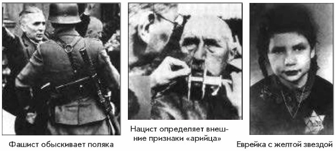 По всей Европе, подвластной Третьему рейху, началась реализация расовых законов фашистов. Как утверждал Гиммлер, «господствовать должен немец» — представитель «высшей арийской расы», наделенный разумом, благородством и т.д. Те, кто по крови, внешнему облику не соответствовали «признакам чистокровного арийца» (славяне, цыгане и др.), считались «недочеловеками» — полуживотными. Оккупационные власти запрещали им получать образование, медицинскую помощь и объявляли главной обязанностью «труд на немцев и покорность». Немецкие власти разрешали своим солдатам без суда расстреливать «недочеловеков» за малейшее неповиновение. Специально организовав голод, «развивая технику уничтожения», фашисты начали «освобождать жизненное пространство от лишнего славянского населения». Это был геноцид — спланированное уничтожение людей определенной национальности. Евреев же расовая теория объявляла даже не «недочеловеками», а «вирусами-паразитами». Части СС и полицаи из местных жителей сгоняли евреев в закрытые городские кварталы — гетто. Потом всех поголовно — мужчин, женщин, детей — либо сразу расстреливали, либо отправляли в концлагеря. Всего нацистами было уничтожено свыше 6 млн европейских евреев (сейчас это называют холокост*). В концлагерях за колючей проволокой с номерами вместо имен оказались также миллионы военнопленных, коммунистов и антифашистов всех национальностей - русских, поляков, югославов, французов, немцев и т.д. Сначала изнурительной работой их превращали в ходячие скелеты, а потом травили в газовых камерах и сжигали в печах крематориев. Волосы погибших использовали для набивки матрасов, а пепел - для удобрения полей. Японцы в своей зоне оккупации провозгласили лозунг «Азия для азиатов», но при этом нещадно эксплуатировали другие азиатские народы, испытывали на них бактериологическое оружие.