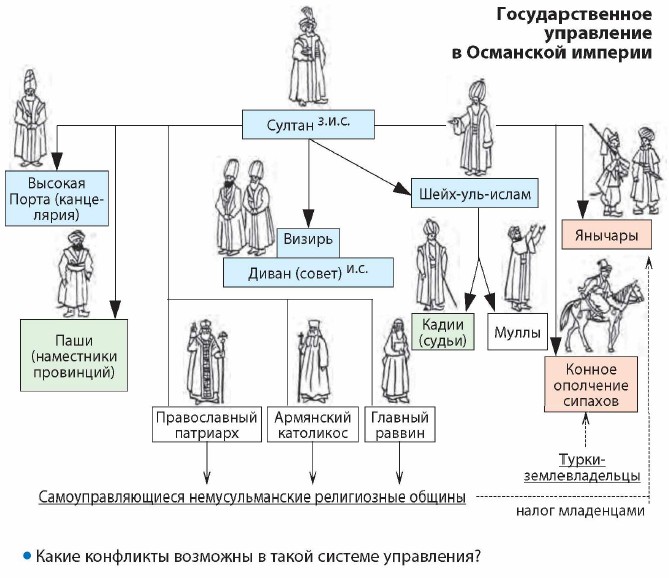 Ближайшим соседом христианской Европы была Османская империя, чьи владения раскинулись сразу в трёх частях света. В целом большинство жителей империи было мусульманами, и только на Балканах они уступали по численности христианам и иудеям. Вся высшая светская и религиозная власть над 15 миллионами подданных Османской империи принадлежала султану. Его именовали «оплотом ислама», «халифом» и «тенью Бога на земле». Почти каждый день султан начинал с посещения деловой части дворца. В особом здании на мягких подушках заседал государственный совет — диван. Государственные дела, отношения с иностранными послами тщательно фиксировались на бумаге в государственной канцелярии — Высокой Порте, расположенной по соседству. Её именем — Порта — европейцы называли всё турецкое правительство. Из её окна был виден Семибашенный замок — хранилище казны и сокровищ султана и одновременно главная тюрьма империи. Устав от государственных дел, султан удалялся в особую часть дворца — свои личные покои. Здесь он мог отдохнуть под золотым балдахином на мягких атласных матрасах, прогуляться в саду под стеклянной крышей среди фонтанов и диковинных птиц. Здесь же располагался гарем — дом многочисленных жён и наложниц султана. Из всех провинций империи сюда свозили красавиц, обречённых вести жизнь в четырёх стенах под присмотром евнухов. Жёны вели скрытую борьбу друг с другом за право быть матерью наследника. Между сыновьями султана часто разгоралась борьба за власть. В смутные времена судьбу престола часто решали янычары. Со всех немусульман империи собирали особый налог — мальчиками 9—10 лет. Оторвав от родителей, их воспитывали в специальных школах, обучая турецкому языку и внушая преданность исламу. Вся янычары считались «рабами султана». Не зная своих родных, живя в походных шатрах, янычары были связаны в одно боевое религиозное братство. Они всегда были готовы прийти на помощь своему господину. Почти 80% населения были жителями сельских соседских общин. Хозяином всей земли считался султан. При этом все земледельцы имели право обрабатывать и передавать детям свой надел. За это они должны были платить либо налоги в казну султана, либо оброк его конным воинам. В целом земледельцам приходилось отдавать только около 1/10 урожая (продуктами или деньгами). Немусульмане платили ещё особый денежный налог — джизью, но во времена расцвета империи он был небольшим. При этом султаны карали смертью любого своего воина, если он «мял посевы, был обвинён в краже скота, пас лошадь на неубранных полях». Поэтому многие христиане с удовольствием переходили границу и селились во владениях султана. В XVI веке число жителей росло. Кроме обычных культур, в Османских владениях стали выращивать американские кукурузу и табак, африканский кофе.
