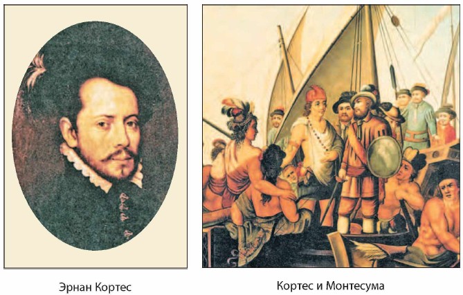 В 1519 году Кортес собрал из испанских колонистов отряд в 508 человек и отправился во владения ацтеков. Жители окраин империи ацтеков встретили Кортеса с радостью. У них существовала легенда о том, что давным-давно с запада из-за моря пришёл «белый человек», который научил индейцев земледелию и ремёслам. Индейцы почитали «белого человека» как Бога и приняли испанцев за его друзей. К тому же вожди местных племён, которые воевали с ацтеками, не желая платить им дань, помогли отряду Кортеса продвинуться в глубь страны, рассчитывая, что это усмирит непокорных. Завоевателям противостояли отдельные отряды ацтеков — воины в доспехах из жёстких птичьих перьев, с каменными топорами, деревянными луками и стрелами. Испанские конкистадоры были закованы в железные латы, могли метать из аркебуз «громы и молнии» и к тому же восседали на лошадях. Поскольку в Америке не знали крупных домашних животных, а лошадей вообще не водилось, индейцам казалось, что конь и всадник — это одно целое, чудовище, атакующее их. Рассеяв несколько ацтекских отрядов, Кортес добился начала переговоров с правителем ацтеков Монтесумой. Тот согласился принять Кортеса в Теночтитлане, столице империи. Один из испанцев писал: «Мы не верили глазам своим — с одной стороны на суше ряд больших городов, а на озере - ряд других. И само озеро покрыто челнами, и на дамбе много мостов, переброшенных через каналы, и перед нами великий город Мехико, а нас только четыре сотни солдат!» Вошедшие в город испанцы были приняты как друзья. Но, несмотря на это, Кортес, как только увидел, что охранников Монтесумы меньше, чем испанских солдат, схватил его. Опасаясь расправы, вождь ацтеков согласился стать вассалом испанского короля и выплачивать дань золотом. Но его жизнь уже ничто не могло спасти. Вскоре он был убит солдатами Кортеса. До другим данным, Монтесума скончался от ран, когда испанцы заставили его утихомирить разбушевавшихся индейцев, а те, в свою очередь, забросали правителя-«предателя» камнями. Государство ацтеков распалось, их города и золотые сокровища из дворцов и храмов достались испанцам. На завоёванных землях испанские переселенцы создали свою колонию — Мексику. Не уступал Кортесу в удачливости и другой известный завоеватель, Франсиско Писарро (между 1470 и 1475—1541). Бывший свинопас, так и не уразумевший грамоты, он не раз встречался с Кортесом после того, как тот покорил земли в Центральной Америке. Писарро мечтал о завоевании державы инков и с отрядом в 200 человек отправился в горы Анды. В 1530—1533 годах у инков как раз шла борьба между двумя братьями — наследниками престола. Одному из них — Атауальпе — Писарро предложил свою помощь. Их встреча состоялась в городе Сахамарке. Католический священник стал уговаривать Атауальпу принять христианскую веру и стать вассалом испанского короля. Вождь в ответ на это бросил протянутую ему Библию на землю, заявив, что никто не имеет права управлять страной Великого Инки без его разрешения. В этом и состоял расчёт Писарро. Атауальпа сейчас же был объявлен еретиком, которого необходимо отдать под суд инквизиции. Окружавшие Инку воины-индейцы были сильно напуганы грохотом испанских пушек и аркебуз, поэтому Писарро ничего не стоило пробраться к трону и захватить Великого Инку в плен. За каких-нибудь полчаса вся площадь, на которой происходила вс