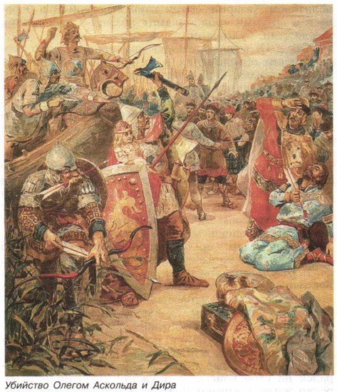Глава I. Древняя Русь в VIII — первой половине XII века § 3. Формирование Древнерусского государства (окончание)Образование государственных центровСогласно «Повести временных лет», в 862 году восточно- славянские и финноязычные племена, проживавшие на северо-западе, прекратили платить дань варягам и изгнали их «за море», т. е. в ту землю, откуда они пришли. Однако очень скоро племена рассорились, дело дошло до вооружённых столкновений. А в это время на их земли стали нападать другие враги. И тогда собрались представители всех племён на вече и решили послать своих послов «за море» к знакомым варягам со словами: «Земля наша велика и обильна, а наряда [управления] в ней нет. Да пойдите [приходите] княжить и володети нами». На приглашение откликнулся князь Рюрик. Он обосновался со своей дружиной в городе Ладоге. Так в северо-западных землях возникло крупное объединение (княжество), центром которого стал построенный Рюриком новый город — Новгород. В первой трети IX века отряды русов появились и на юге. Знатные воины Рюрика Аскольд и Дир по Великому торговому пути отправились в столицу Византии Царьград. Спустившись вниз по Днепру, они увидели раскинувшийся на трёх холмах город. Это был центр полян Киев, который, по преданию, основали три брата: Кий, Щек и Хорив. Жители Киева платили дань хазарам, к тому же их «обижали» древляне и другие племена. Поляне пригласили в город варяжские дружины (возможно, сначала сюда прибыл Аскольд, а Дир — несколько позже). Русы освободили полян от хазарской зависимости. Более того, став правителем Киева, Аскольд принял титул хакана, демонстрируя тем своё равенство с по велителем Хазарии. Затем варяги вступили в борьбу и с другими «обидчиками» полян — древлянами, печенегами, булгарами. Так в IX веке сложились два крупных восточно- славянских объединения, в которых правили приглашённые князья. Одно находилось на севере, в При- ильменье, с центром в Новгороде, другое — на юге, в Приднепровье, с центром в Киеве. Образование Древнерусского государства. Его внутренняя организацияВ 879 году в Новгороде умер Рюрик. Новгородским князем стал его родственник Олег. В 882 году, собрав большое войско, он двинулся в поход на юг. По пути Олег подчинил себе землю кривичей, на которую претендовали южные князья. Подойдя к Киеву, он хитростью выманил из города князей Аскольда и Дира и убил их. Киев Олег объявил «матерью городов русских», столицей своих земель. В дальнейшем он победил ближайших соседей полян — древлян. Затем князь разгромил хазар и освободил от их зависимости северян и радимичей. В результате объединения двух главных центров восточных славян — южного во главе с Киевом и северного во главе с Новгородом — образовалось государство, получившее название Русь. Поскольку это было первое, самое древнее государство восточных славян, то историки называют его Древнерусским государством или Киевской Русью. Главой Руси был киевский великий князь. Он опирался на своё войско — дружину. Дружинники нередко жили с князем под одной крышей, ели с одного стола, делили с ним дань и военную добычу. Князь советовался с дружиной во всех делах. Все племена, признавшие власть Киева, заключали с великим князем договор, в котором они обязывались уплачивать дань мехами, а также хлебом и другими продуктами. С ноября по апрель киевский князь со своей д