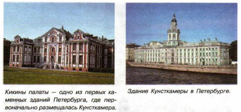 Архитектура Петровского времени представлена прежде всего строительством Санкт-Петербурга, для которого были приглашены лучшие зарубежные специалисты — Ж. Леблон, Д. Трезини, Ф. Б. Растрелли. Но участвовали в этой работе и русские архитекторы И. К. Коробов и М. Г. Земцов. Важнейшими памятниками архитектуры этого времени стали Петропавловский собор и Петропавловская крепость, здание Двенадцати коллегий, Меншиковский дворец в Петербурге, Меншикова башня в Москве, первые сооружения императорского дворцового ансамбля в Петергофе. В изобразительном искусстве первой четверти XVIII века появилось такое новое явление, как гравюра (она пришла на Русь из Европы). Свою популярность она завоевала прежде всего из- за дешевизны. Вскоре гравюры уже широко использовались в учебной литературе, газетах, календарях. Известным мастером- гравером был А. Ф. Зубов. Другой отличительной чертой изобразительного искусства эпохи Петра стал портрет. Одним из основоположников русской светской живописи стал Иван Никитич Никитин (1690—1742), получивший по указу Петра возможность обучения в Италии. Его портретам («Напольный гетман», «Петр I на смертном ложе») присуще правдивое изображение своих героев, интерес к внутреннему миру человека, показу не только его индивидуальных внешних черт, но и характера.