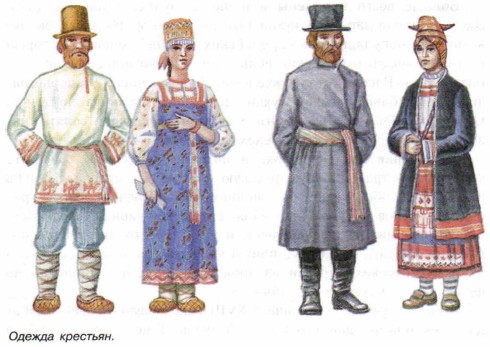 Жилища простого городского населения и крестьян по-прежнему строились из дерева. При возникновении в городе даже небольшого очага пожара возникала угроза выгорания целых кварталов и даже всего города. Впервые в XVIII веке появилась нумерация домов по улицам (раньше она была порядковой и рядом с номером 24 мог быть дом номер 3265). Сами городские дома строились теперь иначе. Если раньше в центре дома была печь, вокруг которой размещались жилые помещения, то теперь центральное место занимал коридор, в который выходило большинство комнат. Все чаще даже в небогатых городских домах в окна вставляли стекла, а не слюду, как прежде. Крестьянские же избы и строились, и содержались по-старому. XVIII век не принес практически никаких перемен. ОдеждаВ одежде высших слоев российского общества в течение XVIII века произошли огромные изменения. Введенные Петром I западноевропейские фасоны платья и обуви, головных уборов и зимней одежды теперь уже никто не внедрял насильно. Русское дворянство вначале выписывало модные одежды из Европы, а вскоре стало приглашать модельеров из Франции, Австрии, Голландии прямо в Петербург. Вместо длиннополой мешковатой традиционной одежды дворяне надевали теперь тонкие рубашки с кружевами, галстуками и бантами, короткие и узкие камзолы. Поверх них носили кафтаны из бархата или плотного шелка. Рукава были украшены золотым шитьем и жемчугом. Стоимость парадного платья Г. А. Потемкина составляла, например, 200 тысяч рублей, что было примерно равно годовому оброку 40 тысяч его крестьян. Самой модной обувью были туфли с квадратными носами на невысоком каблуке. Их пряжки были богато украшены, подчас даже бриллиантами. Цена такой обуви порой достигала стоимости нескольких деревень с крепостными крестьянами. Обязательными предметами туалета были перчатки, карманные часы и трости. Все это также было богато украшено золотом и самоцветами. В обязательном порядке не только женщины, но и мужчины должны были носить напудренные парики («львиные гривы» или «крысиные хвосты»). Не менее сложными и дорогими были и женские наряды. Обязательным их атрибутом был корсет, в который женщину затягивали изо всех сил, прежде чем надеть на нее платье (ее талия казалась теперь очень узкой). Нижняя часть платья, наоборот, с помощью специального каркаса была сильно расширена. Шили платья из разных, но очень дорогих материалов. Считалось неприличным появляться в одном и том же платье несколько раз в одном обществе. В связи с этим у дамы из высшего общества имелось всегда огромное количество платьев. У императрицы Елизаветы Петровны, например, во время московского пожара сгорело четыре тысячи платьев. Когда же она умерла, после нее осталось еще 15 тысяч платьев.
