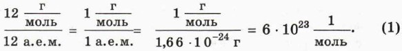 Такой выбор атомной единицы массы был обусловлен соображениями удобства при расчётах: во-первых, углерод входит в очень большое число химических соединений, во-вторых, при таком выборе атомной единицы массы значения масс многих атомов оказываются близкими к целым числам. Сколько молекул в одном моле?По определению в одном моле любого вещества содержится столько же молекул, сколько атомов в 12 г углерода. Значит, чтобы найти число молекул в одном моле, надо разделить 12 г, то есть массу одного моля углерода, на массу одного атома углерода, равную 12 а. е. м. В результате получим: