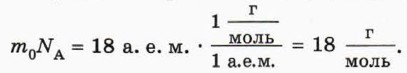 § 40. Уравнение состояния идеального газа Молярная массаМассу одного моля вещества называют молярной массой и обозначают М. Найдем молярную массу воды. Для этого массу m0 молекулы воды (18 а. е. м.) умножим на число молекул в одном моле, то есть на постоянную Авогадро NA. Согласно формуле (1) значение постоянной Авогадро равно отношению 1 г к 1 а. е. м., поэтому для молярной массы воды получаем: