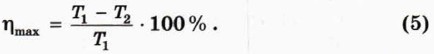 В этой формуле Т1 — температура нагревателя, а Т2 — температура холодильника. Как увеличить КПД теплового двигателя? Из формулы (5) следует, что этого можно достичь двумя способами: повышая температуру Т1 нагревателя и понижая температуру Т2 холодильника. Какой способ более эффективен? Чтобы ответить на этот вопрос, заметим, что температура холодильника Т2 не может быть ниже температуры окружающего воздуха, поэтому особенно сильно понизить её невозможно. Следовательно, единственно возможный путь — повышать насколько возможно температуру Т1 нагревателя. Однако и тут есть ограничение: температура нагревателя не должна превышать температуру плавления материалов, из которых изготовлен двигатель. Формула (5) соответствует максимально возможному КПД теплового двигателя. У реальных тепловых двигателей он существенно меньше максимально возможного. Например, КПД лучших двигателей внутреннего сгорания составляет 30—40 %.