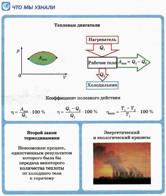 § 43. Тепловые двигатели. Второй закон термодинамики Энергетический и экологический кризисы (окончание)Учёные установили, что средняя температура на Земле в течение последних десятилетий неуклонно повышается. Одной из причин этого может быть работа большого и всё возрастающего количества тепловых двигателей — в основном на электростанциях и в автомобилях. Это грозит глобальным потеплением с весьма нежелательными последствиями. К их числу относятся таяние ледников и подъём уровня мирового океана. Кроме того, при сжигании топлива в тепловых двигателях расходуется необходимый для жизни атмосферный кислород, а также образуются вредные вещества, загрязняющие атмосферу. Качество воздуха в больших городах оставляет желать лучшего. Чтобы смягчить негативные последствия работы тепловых двигателей, стараются максимально повысить их КПД и уменьшить выбросы вредных веществ.