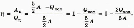 а) Найдите соотношение между работой газа в этом процессе и количеством теплоты, полученным газом. Учтите, что в данном случае обе эти величины отрицательны. б) Выразите работу Авнеш, совершённую в этом процессе над газом, через количество теплоты Qхол, отданное газом холодильнику. Используя результаты, полученные при выполнении предыдущих заданий, получаем, что работу Ац, совершённую газом за один цикл, можно выразить через заданные величины: