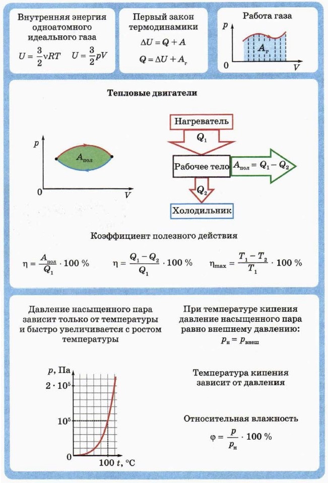 § 48. Применение уравнения теплового баланса Дополнительные вопросы и задания к § 48. Применение уравнения теплового баланса11. Чтобы нагреть на плите некоторую массу воды от 20 °С до температуры кипения, потребовалось 6 мин. Сколько времени потребуется, чтобы вся эта вода выкипела? Примите, что потерями тепла можно пренебречь. 12. В калориметр, содержащий лёд массой 100 г при температуре 0 °С, впускают пар при температуре 100 °С. Чему будет равна масса воды в калориметре, когда весь лёд растает и температура воды будет равна 0 °С? 13. Нагретый алюминиевый куб положили на плоскую льдину, температура которой 0 °С. До какой температуры был нагрет куб, если он полностью погрузился в лёд? Примите, что потерями тепла можно пренебречь. Удельная теплоёмкость алюминия 0,92 кДж/(кг • К). 14. Свинцовая пуля ударяется о стальную плиту и отскакивает от неё. Температура пули до удара равна 50 °С, скорость 400 м/с. Скорость пули после удара равна 100 м/с. Какая часть пули расплавилась, если во внутреннюю энергию пули перешло 60 % потерянной кинетической энергии? Удельная теплоёмкость свинца 0,13 кДж/(кг • К), температура плавления 327 °С, удельная теплота плавления 25 кДж/кг. 15. В калориметр, в котором содержится 1 л воды при температуре 20 °С, кладут 100 г мокрого снега, содержание воды в котором (по массе) составляет 60 %. Какая температура установится в калориметре после установления теплового равновесия? Тепловыми потерями можно пренебречь. Подсказка. Под мокрым снегом подразумевают смесь воды и льда при температуре 0 °С. ГЛАВНОЕ В ЭТОЙ ГЛАВЕ