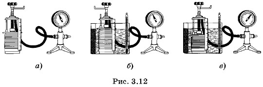 Уравнение состоянияВ § 3.5 и 3.6 вы ознакомились с поведением идеального газа в специально созданных условиях. Два параметра из трех (р, V или V, Т) изменялись при постоянном значении третьего (Т или р). Обычно же в природе и технике у газа меняются сразу все три параметра. Например, когда нагретый у поверхности Земли воздух поднимается вверх, то он расширяется, давление его уменьшается и температура понижается. Используя газовые законы (3.5.2) и (3.7.8), можно получить уравнение, связывающее все три параметрар, V и Т, характеризующие состояние газа данной массы. Это уравнение называют уравнением состояния идеального газа. Изменение состояния газаДля опыта используем уже известный нам прибор (см. рис. 3.7). Пусть в начальном состоянии 1 газ в сосуде (рис. 3.12, а) имеет давление р1, объем V1 и температуру Т1, равную температуре окружающего воздуха. Затем газ переходит в конечное состояние 2, при котором давление, объем и температура будут иметь значения р2, V2, Т2. Какова связь между всеми этими величинами?
