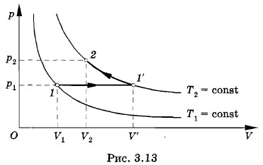 Переведем газ из состояния 1 в состояние 2 с помощью двух процессов, подчиняющихся законам Гей-Люссака и Бойля— Мариотта: изобарного и изотермического. Для этого поместим сосуд в большую банку с водой, нагретой до температуры Т2 (рис. 3.12, б). Вода в банке будет служить термостатом. Одновременно начнем увеличивать объем газа так, чтобы давление р1 оставалось постоянным (изобарный процесс). Газ с течением времени перейдет в промежуточное состояние 1' с объемом V' и температурой Т2. Графически этот переход изобразится прямой 1—1' на рисунке 3.13.