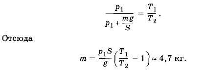 Задача 5В цилиндре под поршнем находится воздух при давлении p1 = 2 • 105 Па и температуре t1 = 27 °С. Определите массу т груза, который нужно положить на поршень после нагревания воздуха до температуры t2 = 50 °С, чтобы объем воздуха в цилиндре стал равен первоначальному. Площадь поршня S = 30 см2. Решение. Так как в процессе нагревания объем воздуха в цилиндре не изменяется, то согласно закону Шарля имеем Решение. Так как в процессе нагревания объем воздуха в цилиндре не изменяется, то согласно закону Шарля имеем
