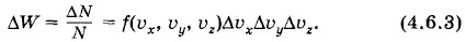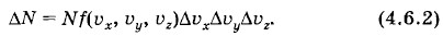 Число точек ΔN в некотором малом объеме ΔυxΔυyΔυz пространства скоростей, очевидно, равно этому объему, помноженному на плотность точек внутри него. (Аналогично масса Δm некоторого объема ΔV равна произведению плотности вещества р на этот объем: Δm = ρΔV.) Обозначим через Nƒ(υx, υy, υz) среднюю плотность точек в пространстве скоростей, т. е. число точек, приходящихся на единицу объема пространства скоростей (N — общее число молекул газа). Тогда