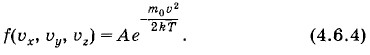 Функция ƒ(υx, υy, υz) называется функцией распределения молекул по скоростям и представляет собой плотность вероятности, т. е. вероятность, отнесенную к единичному объему пространства скоростей. Скорости молекул в данный момент времени в принципе могут оказаться любыми. Но вероятность различных распределений скоростей неодинакова. Среди всех возможных мгновенных распределений имеется одно, вероятность которого больше, чем всех других, — наиболее вероятное распределение. Максвелл установил, что функция распределения ƒ(υx, υy, υz), дающая это наивероятнейшее распределение скоростей молекул (распределение Максвелла), определяется отношением кинетической энергии молекулы