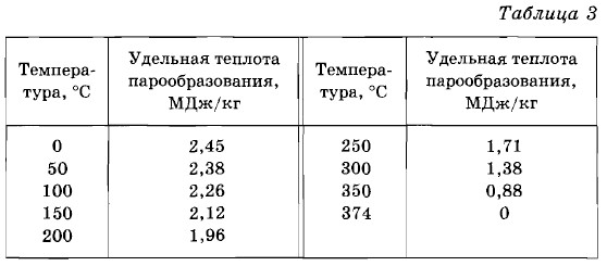 где r — удельная теплота парообразования жидкости; m — масса жидкости; Qп — ее теплота парообразования. Единицей удельной теплоты парообразования в СИ является джоуль на килограмм (Дж/кг). Удельная теплота парообразования воды очень велика: 2,256 • 106 Дж/кг при температуре 100 °С. У других жидкостей (спирт, эфир, ртуть, керосин и др.) удельная теплота парообразования меньше в 3—10 раз. Зависимость удельной теплоты парообразования от температурыДля одной и той же жидкости удельная теплота парообразования при разных температурах имеет разное значение. При повышении температуры удельная теплота парообразования уменьшается, так как с ростом температуры уменьшается разность между объемом жидкости и объемом ее насыщенного пара. Поэтому уменьшается изменение внутренней энергии и работа против сил внешнего давления. Значения удельной теплоты парообразования воды при разных температурах приведены в таблице 3.