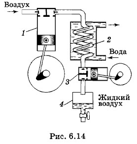 На рисунке 6.14 приведена упрощенная схема поршневого детандера. Атмосферный воздух поступает в компрессор 1, где сжимается до давления в несколько десятков атмосфер. Нагретый при сжатии воздух охлаждается в теплообменнике 2 проточной водой и поступает в цилиндр детандера 3. Здесь он, расширяясь, совершает работу, толкая поршень, и охлаждается настолько сильно, что конденсируется в жидкость. Сжиженный воздух поступает в сосуд 4.