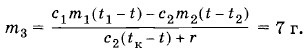 Объем сосуда должен быть уменьшен на 0,3 м3. Задача 3Кусок алюминия массой m1 = 537 г, нагретый до температуры t1 = 200 °С, опустили в воду массой m2 = 400 г при температуре t2 = 16 °С. Вода нагрелась до температуры t = 50 °С и частично испарилась. Определите массу испарившейся воды. Удельная теплоемкость алюминия с1 = 920 Дж/(кг • К). Удельная теплоемкость воды с2 = 4200 Дж/(кг • К), а удельная теплота парообразования воды при температуре кипения (tK = 100 °С) равна r = 2,26 МДж/кг. Тепловыми потерями пренебречь. Решение. Количество теплоты, отданное куском алюминия: Q1 = c1m1(t - t1). Количество теплоты, полученное водой, складывается из количества теплоты, полученного всей водой при нагревании от t2 до t: Q2 = c2m2(t - t2). и количества теплоты, израсходованного для нагревания части воды массой m3 от t до tK и ее испарения при этой температуре: Q3 = c2m3(tK -t) + rm3. Пренебрегая тепловыми потерями, запишем уравнение теплового баланса: Q3 + Q3 + Q3 = 0. или c1m1(t - t1) + c2m2(t - t2) + c3m3(tK - t) + rm3 = 0. Откуда