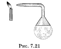 Влияние кривизны поверхности на давление внутри жидкостиВ существовании этого влияния можно убедиться на простом опыте. Возьмем стеклянную воронку с изогнутой под прямым углом трубкой. Направим конец воронки с выдутым мыльным пузырем на пламя свечи (рис. 7.21). Мы заметим, что пламя свечи отклоняется. Это говорит о том, что из воронки воздух вытекает, значит, давление воздуха в пузыре больше атмосферного.