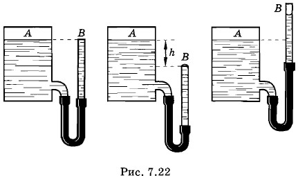 Представляет интерес и такой опыт. Соединим широкий сосуд А при помощи резиновой трубки с узкой стеклянной трубкой. Наполним эти сообщающиеся сосуды водой. Сначала установим конец трубки В на уровне жидкости в сосуде А. В этом случае поверхность воды в трубке В, как и в сосуде А, является плоской (рис. 7.22, а). Так как вода в обоих сосудах находится на одном горизонтальном уровне, то давление непосредственно под плоской поверхностью жидкости в обоих сосудах одинаково и равно атмосферному. Станем медленно опускать трубку В. Мы заметим, что поверхность воды в ней приобрела выпуклую сферическую форму (рис. 7.22,6). Теперь вода в сосуде А и трубке В находится не на одном уровне. Давление воды в сосуде А на уровне конца трубки В больше атмосферного на величину ρgh, где ρ — плотность воды, h — разность уровней воды в сосудах А и В. Так как жидкость в сообщающихся сосудах А и В находится в равновесии, то у конца В непосредственно под выпуклой поверхностью давление тоже больше атмосферного.