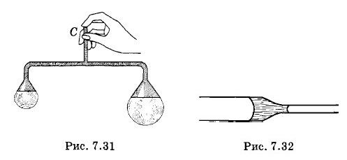 Глава 7. Поверхностное натяжение в жидкостях Упражнение 6 на тему: Поверхностное натяжение в жидкостях1. Какую работу надо совершить, чтобы выдуть мыльный пузырь диаметром D = 12 см? Поверхностное натяжение мыльного раствора считать равным 4 • 10-2 Н/м. 2. Каким усилием можно оторвать тонкое металлическое кольцо от мыльного раствора (σ = 4 • 10-2 Н/м), если диаметр кольца 15,6 см, масса 7,0 г и кольцо соприкасается с раствором по окружности? 3. Каким образом, используя явления смачивания и несмачивания, можно осуществить минимальный и максимальный термометры? 4. При удалении с поверхности ткани жирного пятна рекомендуется смачивать пропитанной бензином ваткой края пятна. Смачивать бензином сразу само пятно не следует. Почему? 5. Чтобы мазь лучше впитывалась в смазанные лыжные ботинки, их нагревают. Как нужно нагревать ботинки — снаружи или изнутри? 6. Почему с помощью утюга можно вывести пятно жира с костюма? 7. Почему при сушке дров на солнце на конце полена, находящемся в тени, выступают капельки воды? 8. На сколько давление воздуха внутри мыльного пузыря больше атмосферного давления, если диаметр пузыря D = 10 мм? Поверхностное натяжение мыльного раствора σ = 4 • 10-2 Н/м. 9. Из трубки с раструбами на концах выдули два мыльных пузыря (рис. 7.31), после чего закрыли пальцем трубку С. Будет ли воздух переходить из одного пузыря в другой? До каких пор? 10. В носик стеклянной трубки от пипетки (рис. 7.32) попадает капля воды. В какую сторону при этом устремляется капля — к широкому или узкому концу трубки? Почему?