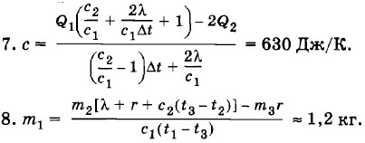 9. m = 0,05 кг. 10. 88%. 11. 78 г. 12. 3,36 • 105 Дж/кг. 13. 5,6 г. 14. t = 0 °С. 15. υ = 2460 м/с.