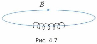 Подсказка. Воспользуйтесь тем, что Итак, траектория заряженной частицы как бы «навивается» на линии магнитной индукции. Это явление играет большую роль в природе и технике. Так, летящие от Солнца заряженные частицы не достигают поверхности Земли, потому что их траектории «навиваются» на линии магнитной индукции магнитного поля Земли. Это спасает нас от жёсткого излучения. Советские физики И. Е. Тамм и А. Д. Сахаров предложили использовать особенности движения заряженных частиц в магнитном поле для удержания высокотемпературной плазмы (сильно нагретого почти полностью ионизированного газа). Это необходимо для исследований по управляемому термоядерному синтезу. В устройстве, названном «токамак», траектории движущихся заряженных частиц «навиваются» на линии магнитной индукции кольцеобразной формы (на рисунке 4.7 часть траектории одной из заряженных частиц показана пунктиром). Благодаря этому возникает «магнитная ловушка»: частицы плазмы не вылетают за пределы заданного пространства.