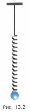 § 13. Более сложные вопросы колебаний Колебания груза, подвешенного на пружине (окончание)Отсюда следует, что подвешенный на пружине груз будет совершать вертикальные колебания с теми же периодом и частотой, что и груз той же массы, укреплённый на горизонтальной пружине той же жёсткости. Отличие состоит только в том, что положению равновесия соответствует теперь растянутая пружина, удлинение которой х0 выражается формулой (5).