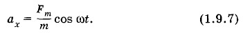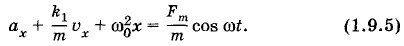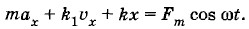 Глава 1. Механические колебания Вынужденные колебанияУравнение движения для вынужденных колебанийПриступим к решению основной задачи: выясним, от чего и как зависят амплитуда хm вынужденных колебаний и сдвиг фаз φс. Для этого запишем и исследуем уравнение движения для вынужденных колебаний. Пусть на колебательную систему (груз на пружине) действует внешняя периодическая сила Fx = Fm cos ωt. Кроме того, на тело действует сила упругости (Fу)x = -kx и сила сопротивления, пропорциональная скорости: (Fc)x = -k1υx, где k1 — коэффициент сопротивления. (При малых скоростях движения тела силу сопротивления можно считать пропорциональной скорости.) Тогда уравнение движения запишется так: