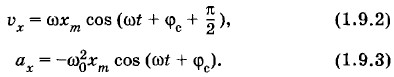 Чем меньшее сопротивление испытывает система, тем большую амплитуду будут иметь установившиеся колебания. Работа сил сопротивления пропорциональна коэффициенту сопротивления k1, и равенство |А'2| = |А1| (соответствующее пересечению графиков 1 и 2', см. рис. 1.17) при малом сопротивлении (k'1 < k1), может быть достигнуто при большей амплитуде (ОС > ОB). Разумеется, при этом требуется и большее время для того, чтобы колебания установились. Установившиеся вынужденные колебания происходят с частотой со и амплитудой хm по гармоническому закону: х = хm cos (ωt + φс). (1.9.1) Внешне вынужденные установившиеся колебания выглядят так же, как и свободные колебания в системе без трения. Но если при свободных колебаниях амплитуда хm и начальная фаза φ0 определяются начальными условиями, то при вынужденных колебаниях хm и φс определяются (как мы увидим в дальнейшем) параметрами самой системы и внешней силой. Прежде всего играет существенную роль соотношение частот собственных и вынужденных колебаний. Величина φс в случае вынужденных колебаний — это не начальная фаза, а сдвиг фаз между колебаниями координаты и внешней силы. Скорость и ускорение при вынужденных колебаниях определяются такими же уравнениями, как и при свободных колебаниях: