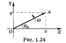 Наиболее просто складываются гармонические колебания одинаковых частот. Предварительно рассмотрим проекцию вращающегося вектора. Пусть вектор Модуль вектора φ = ωt + φ0. (1.11.1) Проекция вектора х = a cos φ = a cos (ωt + φ0). (1.11.2) Одновременно- проекция этого вектора на ось Y оказывается равной у = a sin (ωt + φ0). (1.11.3) Мы получили простой, но важный результат.