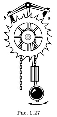 Простой системой такого типа являются обыкновенные часы с маятником. Система обладает определенным запасом энергии — потенциальной энергией гири, поднятой над землей, или энергией сжатой пружины. Гиря приводит во вращение храповое колесо с косыми зубцами (рис. 1.27). С маятником скреплена дугообразная планка аb — анкер* с двумя выступами по краям. С помощью анкера маятник. управляет вращением храпового колеса и связанной с ним стрелки часов. При этом энергия от гири порциями поступает к маятнику. В изображенном на рисунке положении зубец давит на скос выступа b анкера и толкает маятник влево. После прохождения маятником положения равновесия выступ b соскальзывает с зубца, но почти сразу же анкер внешним скосом выступа а упирается в другой зубец храповика, и маятник испытывает толчок в другую сторону. В результате дважды за период маятник получает энергию, сам открывая и закрывая доступ энергии от источника. * Немецкое слово анкер означает якорь. Незатухающие колебания маятника происходят с частотой, почти точно равной частоте его свободных колебаний, если трение мало. Именно поэтому часы обладают регулярным ходом. Впервые маятник был применен для достижения регулярного хода часов Гюйгенсом в 1657 г. В часах с заводной пружиной вместо маятника обычно применяется балансир (колесико с пружиной), совершающий крутильные колебания вокруг своей оси. Автоколебательные системыСистемы, подобные часам, в которых генерируются незатухающие колебания за счет поступления энергии от источника, называются автоколебательными системами. Незатухающие колебания, которые могут существовать в системе без воздействия на нее внешних периодических сил, называются автоколебаниями. В то время как частота вынужденных колебаний совпадает с частотой внешней силы, а амплитуда колебаний зависит от амплитуды этой силы, частота и амплитуда автоколебаний определяются свойствами самой системы. Автоколебания отличаются и от свободных колебаний тем, что, во-первых, они не затухают с течением времени и, во-вторых, их амплитуда не зависит от начального кратковременного воздействия («толчка»), которое возбуждает колебания. К автоколебательным системам относятся электрический звонок с прерывателем, органная труба, свисток и многое другое. Наше сердце и легкие тоже можно рассматривать как автоколебательные системы. * * * Мы заканчиваем знакомство с механическими колебаниями. В заключение обратим внимание на одну общую для всех колебаний черту, отличающую их от других видов механического движения. Как правило, при рассмотрении механического движения тел, например космических кораблей или планет под действием сил всемирного тяготения, задача состоит в нахождении положения тела и его скорости в любой момент времени. Но при изучении периодических колебательных процессов главный интерес представляют общие признаки, характеризующие повторяемость движений, а не положение и скорость колеблющегося тела в любой момент времени. Важно знать амплитуду, период колебаний, т. е. величины, характеризующие процесс в целом. При вынужденных колебаниях надо знать соотношение частот вынуждающей силы и свободных колебаний. Именно оно определяет характер течения процесса.