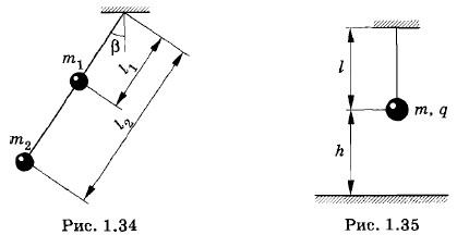 9. Определите период колебаний маятника при малых углах β отклонения от вертикали (рис. 1.34). Стержень, на котором помещены шары массами m1 и m2, считать невесомым. 10. Шарик массой m, имеющий заряд q, подвешен на нити длиной l (рис. 1.35). На расстоянии h под ним находится проводящая плоскость. Определите период Т свободных колебаний маятника при малых углах отклонения от вертикали.
