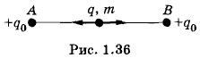 11. Два неподвижных точечных заряда +q0 расположены на расстоянии АВ = r друг от друга. Посередине между этими зарядами расположен шарик массой m, несущий точечный положительный заряд q, который может перемещаться только вдоль линии АВ (рис. 1.36). Определите период Т малых колебаний заряда.