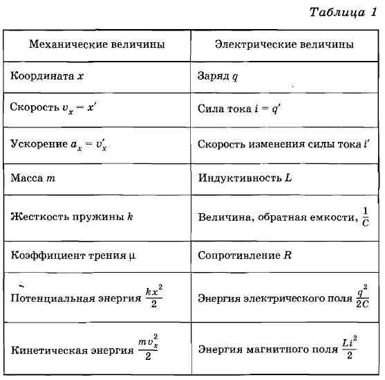 Итак, мы рассмотрели явления в колебательном контуре с качественной стороны и сравнили их с механическими колебаниями. Взаимное соответствие между механическими и электрическими величинами иллюстрируется таблицей 1.