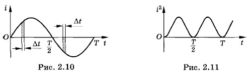 Угол отклонения стрелки амперметра, в котором проволочная рамка с током поворачивается в поле постоянного магнита (прибор магнитоэлектрической системы), пропорционален силе тока. Такой амперметр может измерять силу тока только в цепях постоянного тока. При включении его в цепь переменного тока он покажет нуль. Стрелка обладает инертностью и не успевает отклоняться в такт с изменением силы тока. Она будет лишь слегка дрожать на месте. Мощность в цепи постоянного тока на участке сопротивлением R определяется квадратом силы тока. В случае же переменного тока она определяется средним значением квадрата силы тока. Среднее значение квадрата силы тока за период уже не равно нулю, так как квадрат силы тока на протяжении всего периода положителен (рис. 2.11).