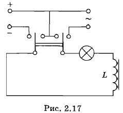 Составим цепь из катушки большой индуктивности и лампы накаливания (рис. 2.17). С помощью переключателя можно присоединять эту цепь либо к источнику постоянного напряжения, либо к источнику переменного напряжения. При этом постоянное напряжение и действующее значение переменного напряжения должны быть одинаковы. Опыт показывает, что лампа светится ярче при постоянном напряжении. Следовательно, действующее значение силы тока в рассматриваемой цепи меньше силы постоянного тока.