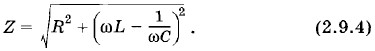Это и есть закон Ома для электрической цепи переменного тока, изображенной на рисунке 2.20. Благодаря сдвигу фаз между напряжениями на различных участках цепи полное сопротивление Z цепи (см. рис. 2.20) выражается так: