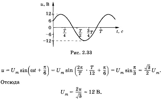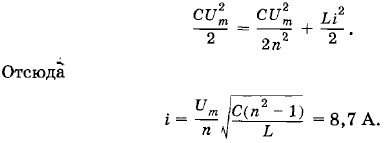 Глава 2. Электрические колебания Примеры решения задач на тему: Электрические колебанияПри решении задач на электрические колебания рекомендуется учесть следующее. В задачах на свободные колебания в контуре, кроме формулы для периода свободных электрических колебаний (2.3.2), можно применять закон сохранения энергии. При решении задач на расчет цепей переменного тока следует иметь в виду, что амперметры и вольтметры в этих цепях показывают действующие значения силы тока (2.5.4) и действующие значения напряжения (2.5.5). В отличие от цепей постоянного тока, обладающих только активным сопротивлением, цепи переменного тока могут иметь еще емкостное сопротивление (2.7.4) и индуктивное сопротивление (2.8.5). Полное сопротивление цепи с последовательно соединенными резистором, конденсатором и катушкой индуктивности определяется по формуле (2.9.4). Закон Ома для цепи переменного тока имеет вид (2.9.5). При последовательном соединении потребителей в цепях переменного тока действующие или амплитудные значения напряжений складываются методом векторной диаграммы. При параллельном соединении потребителей в цепях переменного тока векторно складываются амплитуды сил токов или их действующие значения. В этом случае тоже следует строить векторные диаграммы. При построении векторных диаграмм надо хорошо знать фазовые соотношения между колебаниями силы тока и напряжения в цепях переменного тока. Мощность вычисляется по формуле (2.10.4). Явление резонанса в электрической цепи имеет место при условии (2.11.1). Задача 1Колебательный контур состоит из катушки индуктивностью L = 6 • 10-3 Гн и конденсатора емкостью С = 15 мкФ. Максимальная разность потенциалов на конденсаторе Um = 200 В. Чему равна сила тока i в контуре, когда разность потенциалов на конденсаторе уменьшилась в n = 2 раза? Потерями энергии пренебречь. Решение. Когда напряжение на обкладках конденсатора максимально, вся энергия контура сосредоточена в электрическом поле конденсатора (см. § 2.2.). Она равна Согласно закону сохранения энергии имеем:
