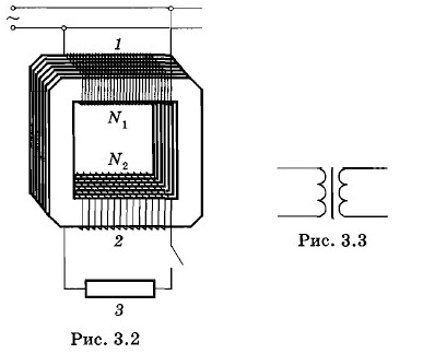 Трансформатор состоит из замкнутого стального сердечника-магнитопровода, на котором располагаются две или несколько обмоток, не имеющих между собой электрического контакта (рис. 3.2). Обмотка 1, к которой подводится электрическая энергия, называется первичной; обмотка 2, к которой присоединяются потребители электроэнергии 3 («нагрузка»), — вторичной.
