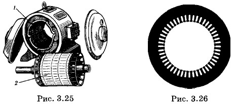 Асинхронный электродвигатель (рис. 3.25) состоит из двух главных частей: неподвижной части — статора 1 и вращающейся части — ротора 2. Статор электродвигателя набирается из отдельных стальных листов (рис. 3.26), которые изолируются друг от друга и образуют конструкцию, показанную на рисунке 3.27. На внутренней поверхности статора в пазах укладывается обмотка.