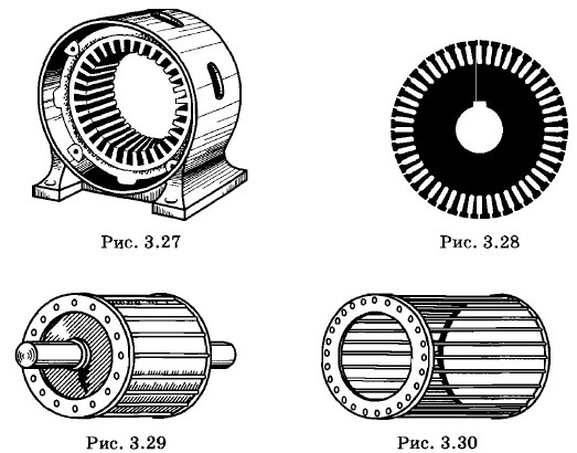 Ротор электродвигателя тоже набирается из стальных листов (рис. 3.28), которые закрепляются на валу (рис. 3.29). В пазы ротора укладываются медные стержни, которые на торцовых частях соединяются друг с другом медными кольцами, образуя обмотку, называемую «беличьим колесом» (рис. 3.30).