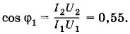 Здесь cos φ2 = 1, так как лампа обладает только активным сопротивлением. Следовательно,
