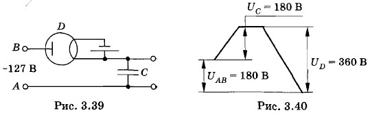 Отсюда φ1 = 56,7°. Задача 2На какие пробивные напряжения должны быть рассчитаны конденсатор С и диод D, если выпрямитель (рис. 3.39) может работать как под нагрузкой, так и без нее? Решение. В течение полупериода, когда лампа оказывается включенной в прямом направлении, конденсатор заряжается до амплитудного напряжения городской сети, равного 127 √2 В = 180 В. Когда диод заперт (не проводит ток), он находится под напряжением сети (с амплитудой 180 В) и напряжением заряженного конденсатора (тоже равного 180 В). Изменение потенциала вдоль цепи в этот момент времени изображено на рисунке 3.40.