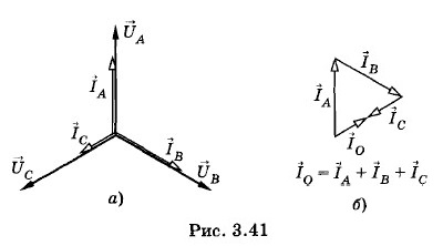 Силу тока в нулевом проводе найдем графическим методом. На рисунке (3.41, а) построены векторы фазных напряжений и фазных сил токов (векторы фазных сил токов и векторы соответствующих фазных напряжений совпадают по направлению, так как нагрузка каждой фазы активная). Складывая векторы сил фазных токов (рис. 3.41, б), получим силу тока в нейтральном проводе IO = 5 А. Сила тока в нулевом проводе отстает по фазе от напряжения UA на угол φ = 60°.