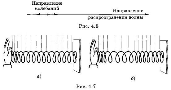 Но не любая волна является поперечной. Колебания могут происходить и вдоль направления распространения волны (рис. 4.6). Тогда волна называется продольной. Продольную волну удобно наблюдать с помощью длинной мягкой пружины большого диаметра. Ударив ладонью по одному из концов пружины (рис. 4.7, а), можно заметить, как сжатие (упругий импульс) бежит по пружине. С помощью серии последовательных ударов можно возбудить в пружине волну, представляющую собой последовательные сжатия и растяжения пружины, бегущие друг за другом (рис. 4.7, 6). Колебания любого витка пружины происходят в направлении распространения волны.
