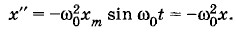 где х" — вторая производная координаты по времени. Согласно уравнению (1.4.1) при свободных колебаниях координата х изменяется со временем так, что вторая производная координаты по времени прямо пропорциональна самой координате и противоположна ей по знаку. Гармонические колебанияИз курса математики известно, что функции синус и косинус обладают тем свойством, что вторая производная функции пропорциональна самой функции, взятой с противоположным знаком. Можно доказать, что никакие другие функции этим свойством не обладают. Значит, координата тела, совершающего свободные колебания, меняется с течением времени по закону синуса или косинуса. Когда тело совершает колебания, его движения периодически повторяются. Поэтому неудивительно, что изменение co временем координаты тела выражается через периодические функции синус или косинус. Периодические изменения физической величины в зависимости от времени по закону синуса или косинуса называются гармоническими колебаниями. Амплитуда колебанийВажной характеристикой колебательного движения является амплитуда. Амплитудой гармонических колебаний называется модуль наибольшего смещения тела от положения равновесия. Амплитуда может иметь различные значения в зависимости от того, насколько мы смещаем тело от положения равновесия в начальный момент времени, и от того, какая скорость сообщается при этом телу. Амплитуда определяется начальными условиями. Но максимальные значения модуля синуса и косинуса равны единице. Поэтому решение уравнения (1.4.1) не может просто выражаться косинусом или синусом. Оно должно иметь вид произведения амплитуды хm на синус или косинус. Решение уравнения движения, описывающего свободные колебанияКакую же форму имеет решение уравнения (1.7.1)? Нельзя просто считать, что х = хm sin t или х = хm cos t, так как в этом случае вместо х" = - Но небольшое усложнение формы решения сразу приведет нас к цели. Чтобы в выражении второй производной x"(t) был множитель х = хm sin ω0t. (1-4.2) В этом случае первая производная (скорость) принимает вид: х' = ω0хm cos ω0t, а вторая производная (ускорение) равна: