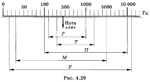 Диапазон обычного человеческого голоса заключен в интервале от 200 до 1000 Гц. У отдельных людей диапазон может оказаться и значительно шире. На рисунке 4.29 представлена шкала звуковых частот, на которой буквой Г обозначен диапазон голоса. Воспринимает же человеческое ухо частоты в интервале, обозначенном буквой У. Музыкальные инструменты занимают немного менее широкую полосу частот, обозначенную буквой М.