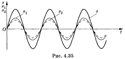 Результат сложения волн, приходящих в точку М, будет зависеть от разности фаз между ними. Пройдя различные расстояния d1 и d2, волны имеют разность хода Δd = d2 - d1 Если разность хода равна длине волны λ, то вторая волна будет запаздывать по сравнению с первой на один период (как раз за период волна проходит путь, равный длине волны). Следовательно, в этом случае гребни (как и впадины) обеих волн будут совпадать. Условие максимумовНа рисунке 4.35 изображена зависимость от времени смещений sx и s2, вызванных двумя волнами, при Δd = λ. Разность фаз колебаний равна нулю (или, что то же самое, 2π, так как период синуса равен 2π). В результате сложения этих колебаний возникает результирующее колебание с удвоенной амплитудой. То же самое будет происходить, если на отрезке Δd укладывается не одна, а любое целое число длин волн.