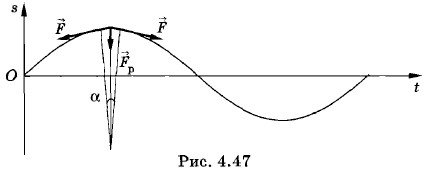 Решение. Рассмотрим малый элемент струны длиной А1, находящийся на гребне волны (рис. 4.47). Равнодействующая сил натяжения, действующих на этот элемент, направлена вниз (см. рис. 4.47) и равна по модулю: